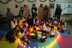 最後にみんなで作ったキャンドルを並べて暗くし、灯りを見ながら平和への願いを込めました。