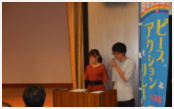 その後、来場者全員参加による「ウルトラピースクイズ」を行いました。平和委員会で行った広島の碑巡りや平和記念資料館で学んだことを全10問のクイズにし、楽しみながら平和について学習しました。