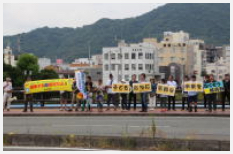 しこくピースアクションリレーは、毎年四国の4県で取り組まれており、今年は香川から徳島-愛媛-高知へとリレーしていき、最終8/4の広島での終結式に各県の代表者が横断幕をつないでいきます。