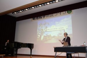 前半は、多田道代さんのピアノ演奏に合わせて、菊池さんから絵本の朗読。人々が避難し誰もいなくなった町に残されたランドセルやトラクター、桜の木などの視点で事故の悲惨さを感じる事ができました。