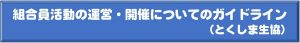 新型コロナウイルス感染症対策のため、とくしま生協が主催する組合員活動(エリア交流会、支所商品活動委員会等)は、このガイドラインにそって開催いたします。その他、地域ネット・グループ・サークル活動つきましては、3密を避けマスク着用の上、ガイドラインを参考にして開催をお願いします。