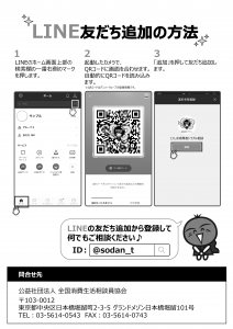 ・ID:LINEアプリホーム画面上部の友だち追加から、次のIDを検索し、友だち登録(ID:@sodan_t)
