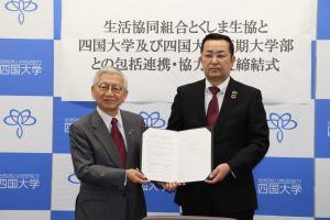 締結式では、四国大学の松重学長、とくしま生協の大久保理事長が協定書に調印し、記念撮影を行いました。