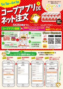 コープの宅配(共同購入・個人宅配・ステーション配送)では【5月28日(土)までにコープアプリ登録】&【5月3回~6月1回の期間中、eふれんずで合計1,000円(税込)以上ネット注文】すると抽選で100名様に「COOP果汁入りソーダアップルケース」をプレゼント!※プレゼントは変更になる場合があります。