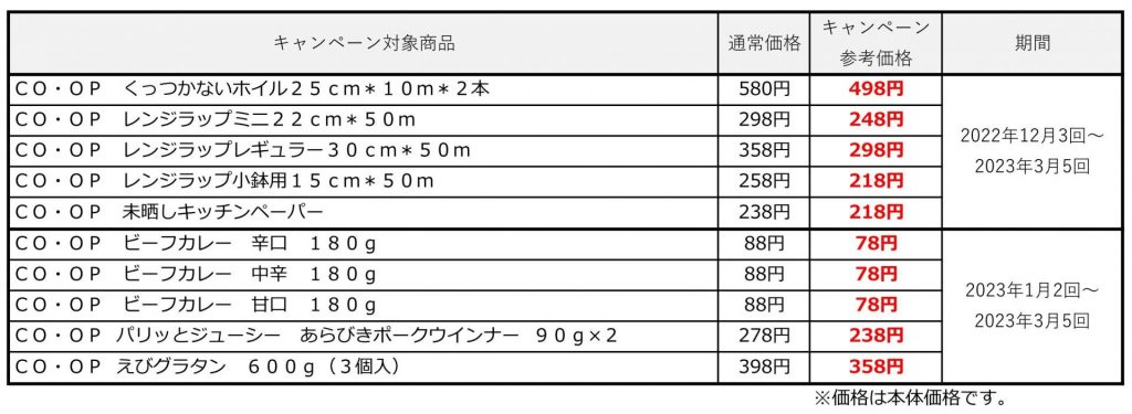 とくしま生協では、先行して2022年12月3回(チラシ配布開始:2022年12月25日)より、CO・OP商品の中から身近な商品を特別価格で提供します。店舗(コープ北島、コープ住吉)は2023年1月からキャンペーンを実施予定です。