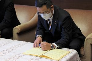 1月31日(火)15:00~徳島県庁にて、第13回「とくしま農山漁村(ふるさと)協働パートナー協定」締結式が行われました。冒頭、出席者の紹介があり、知事及び今回協定を結ぶ3団体の代表者により、協定書への署名が行われました。その後、協定書の交換が行われ、各協定団体の代表者と知事のあいさつ、記念撮影があり、締結式を終了しました。