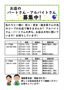 私たちといっしょに 安心・安全・組合員さんの為のコープのお店で働きませんか?アルバイトさん・パートさんの声も、お店は大切に聞いています!お待ちしています!